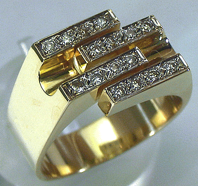 18k yellow gold, 12.00 grams. Round brilliant cut diamonds. 16x1.25=.20 cts. SI2, H. Measures 18x10 mm. / 3/4x3/8".