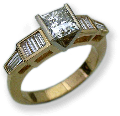 14k white/yellow gold. Centre: Princess cut diamond .80 cts. SI2, D, 5.03 X 4.91 X 3.83 good cut. Sides: Staight/tapered baguette cut diamonds 8x.10=.80 cts. SI2, G. Measures 4.0 mm./3/16" wide.