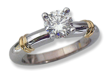 18k white/yellow gold 5.9 grams. Centre: Round brilliant cut diamond .75 cts. SI2, E, 5.82 X 5.89 X 3.62 excellent cut. HRD certified. Measures 3.0 mm./1/8" wide.