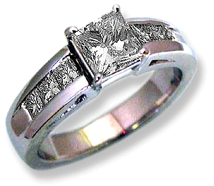 18k white gold 7.5 grams. Centre: Princess cut diamond 1.11 cts. SI2, H, 6.03 X 5.69 X 3.93 medium/good cut.