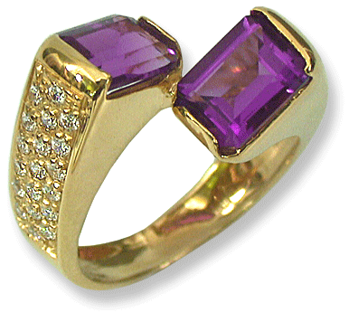 18k yellow gold, 7.90 grams. Side stones, .38 cts. diamonds I1, G. Amethysts, 9.0x6.0 mm. Measures 14 mm. / 9/16" wide.