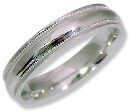 10k white gold, 3.2 grams. Polished finished with milligrain. Comfort fit. Measures 4 mm. / 3/16”. Size 7.