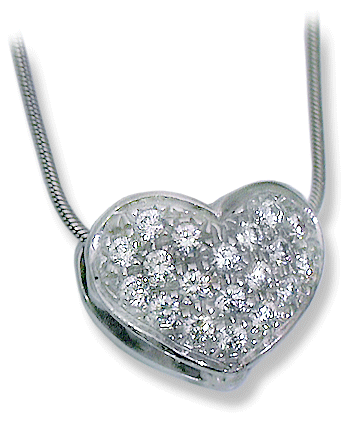 18k white gold, 3.9 grams. Puffed heart slider pendant. Round brilliant cut diamonds, 19x.03=.57 cts. I1, G. Measures 17 wide x 13 mm. high / 11/16" wide x 1/2" high. Round snake chain sold separately.