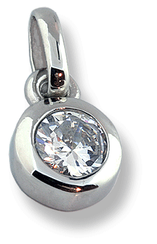 18k white gold, 1.8 grams. Polished finish. Round cut, white CZ, 5.5 mm. Measures 7 mm. / 5/16”. Round snake chain sold separately.