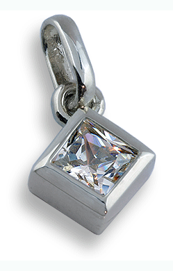 18k white gold, 1.7 grams. Polished finish. Princess cut, white CZ, 5.0 mm. Measures 6 mm. / 1/4”. Round snake chain sold separately.