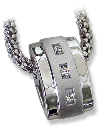 18k white gold, 3.8 grams. Polished/sand-blast finish. Slider pendant. Round brilliant cut diamonds, 3x.03=.09 cts. I1, G. Measures 16 mm. / 5/8” high. Round popcorn link chain sold separately.