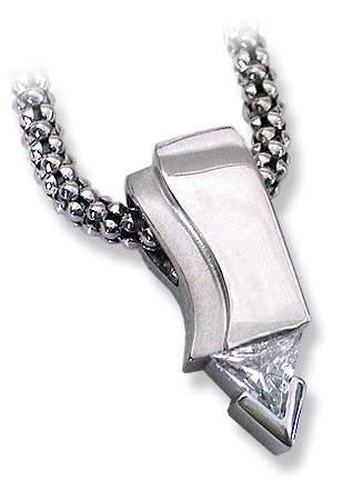 18k white gold, 3.1grams. Polished/sand-blast finish. Slider pendant. Trilliant cut, white CZ, 6.0 mm. Measures 22 mm. / 7/8” high. Round popcorn link chain sold separately.