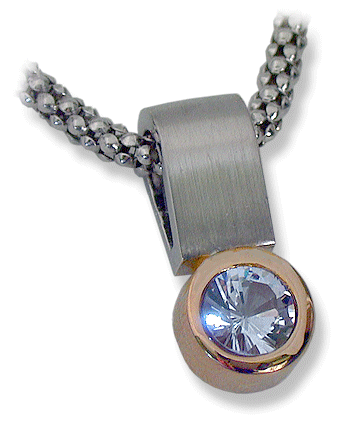 18k white/yellow gold, 3.6 grams. Brushed/polished finish. Slider pendant. Round cut, light blue topaz. Measures 20 mm. / 3/4” high. Round popcorn link chain sold separately.