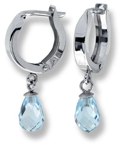 14k white gold, 1.6 grams. Polished finish. Blue topaz briolete. Measures 2.5 x 25 mm. / 1/8 x 1”.