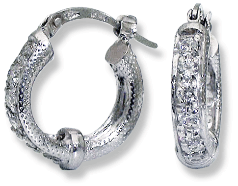 18k white gold, 5.5 grams. Polished, textured finish. Round brilliant cut diamonds, 12 x .03 = .36 cts. I1, G. Measures 16 mm. / 5/8” high.