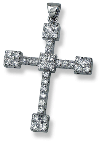 18k white gold, 7.2 grams. Polished finish. Round cut cz’s, pave’ set. Measures 31 x 46 mm. / 1 1/4 x 1 7/8”.