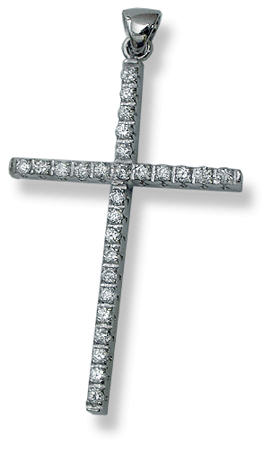 18k white gold, 6.2 grams. Polished finish. Round cut cz’s, pave’ set. Measures 29 x 51 mm. / 1 1/8 x 2”.