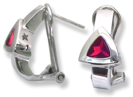 14k white gold, 3.8 grams. Polished finish. Trillium cut garnet, 6 x 6 mm. Measures 16 mm. / 5/8” high.