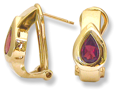 14k yellow gold, 4.0 grams. Polished finish. Pear shape garnet 7 x 5 mm. Measures 17 mm. / 5/8” high.