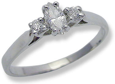 14k white gold, 1.6 grams. Marquis cut diamond .20 cts. I1, G. Round brilliant cut diamonds 2 x .04 = .08 cts. I1, G. Total diamond weight .28 cts. Measures 2.0 mm. / 1/16” wide. Search Loose diamond price list.