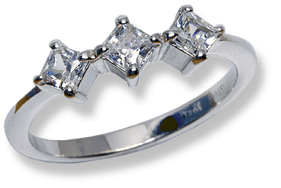 14k white gold, 3.92 grams. High polished finish. With 3 x 4.0 mm., princess cut cubic zirconia, white stones. Measures 5.0 mm. / 3/16" wide.