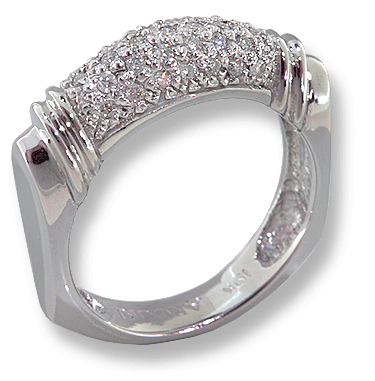 10k white gold, 4.3 grams. High polished finish. Pave’ set, 33 round diamonds. I1, H, weighing, .41 cts. Measures 6 x 20 mm. / 1/4” x 13/16”.