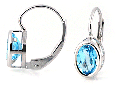 14k white gold, weighing 3.1 grams. High polished finish with lever backs. Bezel set look, oval shape, natural light blue topaz, 7 x 5 mm. ( 2 =2.50 cts. total weight). Overall measures 14 mm. / 9/16" high.