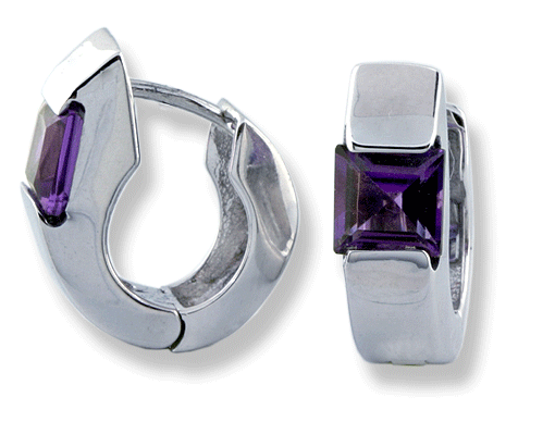 18k white gold, weighing 7.2 grams. High polished finish with convenient one piece hinged backings. Square shape-facated, amethyst (6x6 mm). Overall measures 6 x 18 / mm. / 1/4 x 3/4" high.