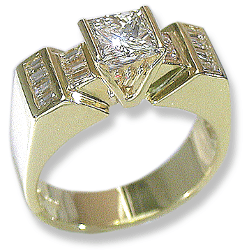 18k yellow gold, 7.4 grams. Polished finish. Sides: Baguette cut diamonds .45 cts. VS2, G. Measures 6.0 mm. / 1/4” wide.
