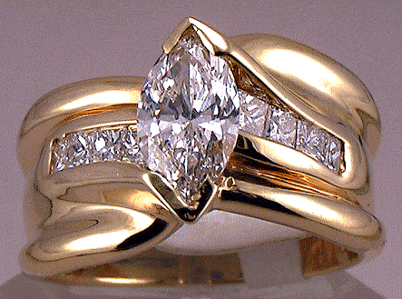 18k yellow gold, 11.3 grams. Polished finish. Sides: Princess cut diamonds 8 x .07 = .56 cts. VS2, G, good cut. Measures 10.5 mm. / 7/16” wide.