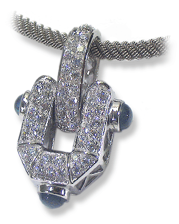 18k white gold, 10.60 grams. Blue cabachon, natural sapphires and white cz.'s. Measures 32 mm. / 1 1/4" high. 18k white gold, twisted rope chain 16"- (20.8 grams)