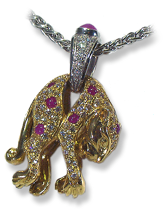 18k yellow/white gold, 14.50 grams. Cabachon rubies and white cz's. Reversable panther, opposite side shows high polished finish. Measures 45 mm. / 1 3/4" high.