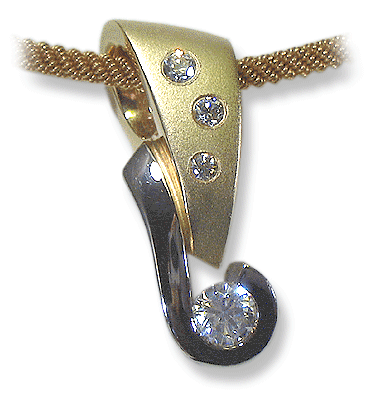 18k yellow/white gold, 5.90 grams. Sand-blast, polish finish. Round brilliant cut diamonds, 1x.48 cts. I1, G, 3x.03=.09 cts. I1, G. Total diamond weight, .57 cts. Measures 30 mm. / 1 1/2" high. Round snake chain sold seperately.