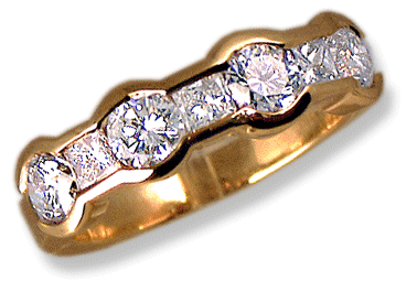 18k yellow gold, 5.7 grams. Round brilliant cut diamonds, 4x.25= 1.00 cts. I1, G. Princess cut diamonds 3x.15=.45 cts. I1, G. Measures 5 mm. / 3/16" wide.
